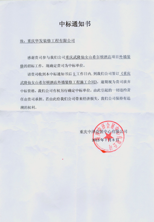 2013年7月8日,我司經過數輪投標、談判,在眾多裝修公司中脫穎而出,成功中標重慶武隆仙女山希爾頓酒店外墻裝修工程。