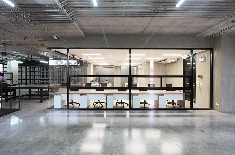 二樓辦公室裝修中充當(dāng)皮革展示區(qū)和辦公空間。每層的窗戶隔片都是可以旋轉(zhuǎn)的,而且窗戶是凹進(jìn)去的,這樣帶來的是間接的光線,不會損傷皮革制品。辦公區(qū)和展示區(qū)都是很寬大的,整體有著很濃的工業(yè)風(fēng)格。