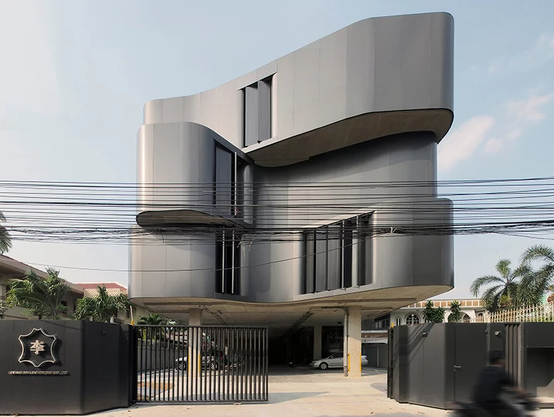 這家泰國的皮革廠,名叫做ASWA,充分考慮到了自己的產(chǎn)品,所以在辦公大樓設(shè)計(jì)方面,一棟彎曲的建筑,把它設(shè)計(jì)成了一條像黑色的腰帶纏繞在上面。下面跟著小編來看看它們的
