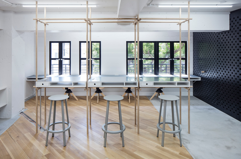 辦公室細節設計中使用的穿孔材料是公司自身產品制成的。這些穿孔,也用于E&Y生產的家具,在空間尺度上表達了企業的身份。該材料還用于傳輸空氣和光,減輕了行政室和會議室的限制條件。這些孔足夠大,可以插入用作門把手和擱板定位銷的木棍。員工可以在任何方便的位置輕松安排貨架。