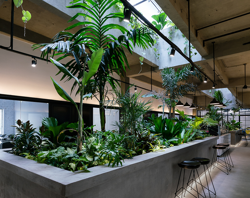 辦公室裝修設計的中央種植園中點綴著休息和工作場所,專門的咖啡吧為您提供輕松的休息。辦公室裝修通過打開一個中央裂口并拆除大部分屋頂,自然陽光通過樹葉層被過濾,并允許通過建筑溢出,增強了自然熱帶植物環境的感覺。當陽光在建筑物上移動時,員工可以感受到一天的時間流動。每個封閉的辦公空間,都能看到這個自然光的地方。