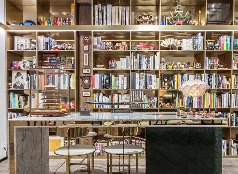 黃金書架是辦公室裝修空間的亮點,你進入空間后一定會注意到。它的設計理念來源于中國的俗語“書中自有黃金屋”。它展示了來自世界各地的書籍,涉及設計和藝術、古董、玩具、作品以及工作室創始人從50多個國家收集的樂高模型。